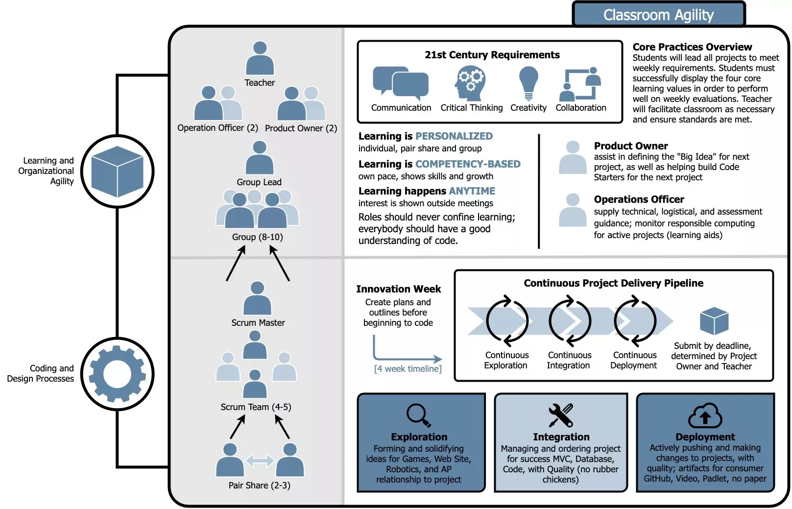 Sprint cadences have ideas/issues that are broken into short term work units called tasks. Teacher establishes Sprint time in class schedule.